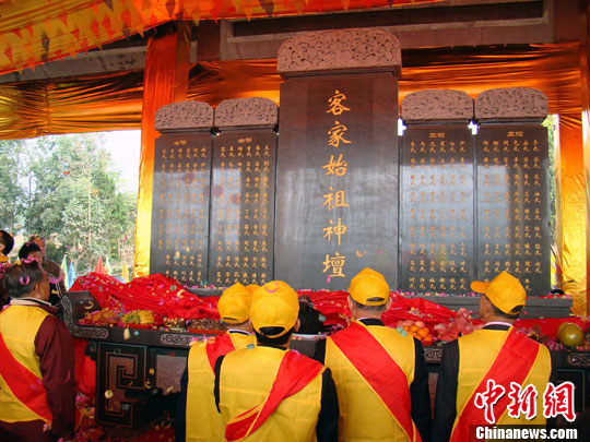 ??? 12月2日,客家始祖神壇在“客家祖地”福建寧化石壁村揭幕,來自新加坡、馬來西亞、泰國、香港、臺灣等國家和地區的1000余名客屬后裔,隨后在客家始祖神壇前舉行第16屆世界客屬石壁祖地祭祖大典。中新社發 張麗勍 攝