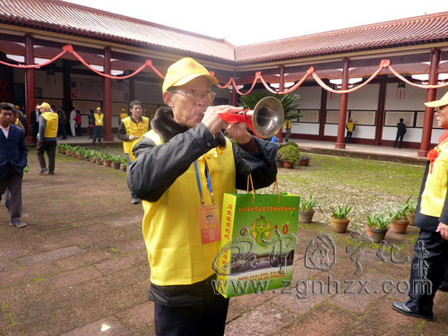 ??? 上午8時(shí)許,來自世界各地的客家鄉(xiāng)賢紛紛步入會(huì)場(chǎng)。在人群中,一位來自江西贛州客聯(lián)會(huì)的老人引起了記者的注意,他一走下車便拿起手中系著紅絲帶的鎖吶,吹起了歡快喜慶的樂曲。只見他鼓起兩腮,十指不停地配合演奏,忽高、忽低、忽遠(yuǎn)、忽近的鎖吶聲源源不絕,歡快喜慶的曲調(diào)彌漫在客家祖地上空。