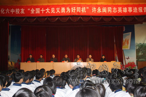 ???? 12月20日,寧化六中87級校友、“全國十大見義勇為好司機”許永閩應邀回母校作英雄事跡報告。該校初二、高二1000多名學生聆聽了報告,反響熱烈。