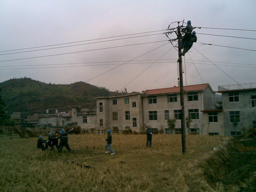 “現(xiàn)在大家一起用力,聽(tīng)我指揮,1、2、3,起···”1月11日中午,在寧化縣曹坊鄉(xiāng)上曹村線路搶修現(xiàn)場(chǎng),該鄉(xiāng)供電所電力技術(shù)人員正全力搶修受損線路。雖然正下著雨夾雪,但他們個(gè)個(gè)干勁十足,一派繁忙景象。
