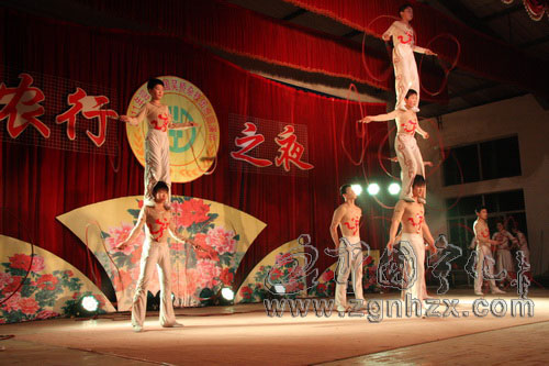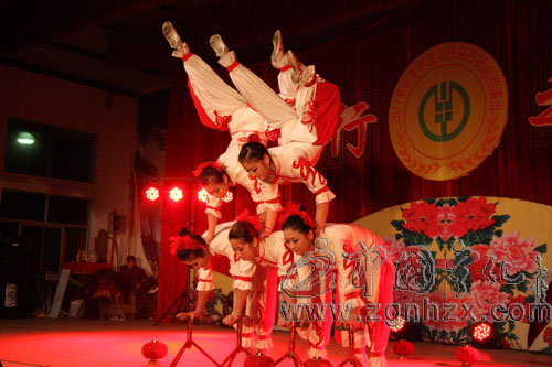 ???? 當晚,演出現場人潮涌動,掌聲此起彼伏。晚會在繩技表演《同一個夢想》中拉開帷幕。表演者們甩動著繩圈擺出各式造型表演翻滾、跳躍等動作,引來在場觀眾的一片驚嘆。《節日-女子造型》、《頂花壇》、《蹬技》、《魔術-脫困》、《柔術滾燈》《雜耍-快樂的炊事員》等精彩的節目逐一登場,現場觀眾叫好連連。由表演者在層層椅子壘成的九米多高空中表演單手倒立的《高椅倒立》可謂驚險刺激,令觀眾屏氣凝神、嘆為觀止。當表演者躺著用腳將200多斤大缸再加上兩個人的體重撐起并轉動的《蹬大缸》,演出氣氛的達到了高潮。最后演出在全體演員的《大武術》中圓滿閉幕。演出結束時廖金輝上臺和演員們逐一握手,并問好。