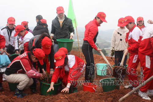 ???? 一說要去植樹,志愿者和同學們個個精神煥發,頭戴著紅色帽,手拿著樹苗、花盆來到云翠山金銀花開發基地。大家認真聽取該縣云翠山農業開發公司工作人員的栽種技術講解后,大家就忙活開了。活動現場,彩旗飄飄,歡聲笑語,學生們在老師和青年志愿者的帶領下,三人一組或四人一組,以“大手牽小手”的方式,相互合作,有的培土,有的扶樹苗,有的用手將土壓實,每個環節都是一絲不茍,忙碌的身影井然有序。盡管不少同學褲腿和鞋子上都沾滿了黃泥,但大家仍然興致盎然。隨后,志愿者和同學們興奮地在“大手牽小手 愛心花卉”標識牌上簽名,插在自己親自栽種好的樹苗旁,他們希望,這些親手栽植的樹苗能與自己一樣共同成長。