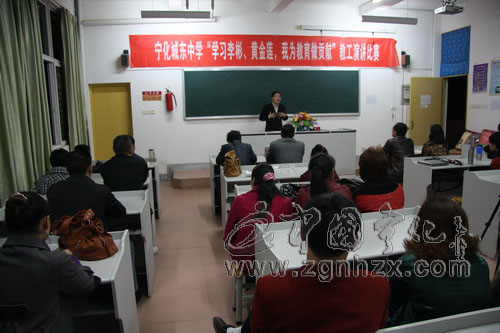 ????? 3月31日晚,寧化縣城東中學在校內舉行以“學習李彬、黃金蓮,我為教育做貢獻”主題的教師演講比賽。該校60余名教職工到場聽講。