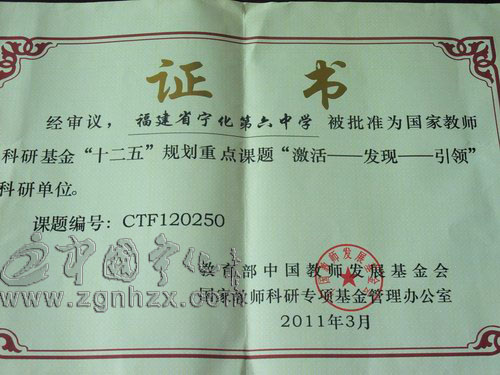 3月30日,寧化六中原創(chuàng)教研課題“激活——發(fā)現(xiàn)——引領(lǐng)”,被教育部中國教師發(fā)展基金立項為國家教師科研基金“十二五”規(guī)劃重點課題,正式成為國家重點課題。