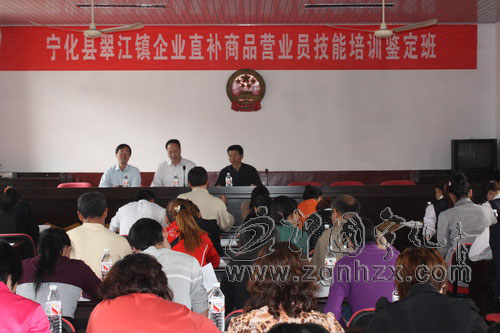 ???? 4月26日上午,寧化縣翠江鎮舉辦企業直補商品營業員技能培訓鑒定班。來自新華都超市、蘇寧電器以及翠江鎮轄區內的各個體初級營業員112人參加了培訓,三明市勞動培訓中心主任葉樹勛到會指導培訓。