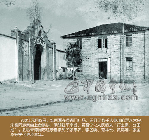 ??? 1930年1月9日,古田會(huì)議后,朱德率領(lǐng)紅四軍第一、三、四縱隊(duì),從古田出發(fā),經(jīng)清流里田進(jìn)入寧化俞坊、馬家、安樂(lè)。10日,從謝坊、丁坑口、魚(yú)龍埔到達(dá)寧化城關(guān),一舉解放了縣城。駐扎在寧化縣城的國(guó)民黨軍閥周志群、盧興邦部早已聞風(fēng)逃跑,11日,紅四軍在縣衙門(mén)口召開(kāi)群眾大會(huì),朱德親臨大會(huì)講演,宣傳革命道理,號(hào)召工農(nóng)群眾起來(lái)鬧革命、打土豪、分田地,建立紅色政權(quán)和地方武裝,并把打土豪沒(méi)收的衣物和糧食分發(fā)給群眾,深受群眾的擁護(hù)。會(huì)后,朱德在縣衙接見(jiàn)了張志農(nóng)、李名驥、黃鴻湘、范祥云、張國(guó)華等寧化進(jìn)步青年,指示他們要迅速發(fā)動(dòng)工農(nóng)武裝暴動(dòng),開(kāi)展土地革命、建立紅色政權(quán)和黨的組織。當(dāng)天,就有一大批青壯年報(bào)名參加了紅軍。13日,朱德率領(lǐng)紅四軍經(jīng)武層,神壇壩進(jìn)入濟(jì)村,在濟(jì)村領(lǐng)導(dǎo)貧苦農(nóng)民批斗當(dāng)?shù)赝梁懒蛹潖埩髅鞯热耍?4日從濟(jì)村出發(fā),經(jīng)龍頭進(jìn)入江西廣昌縣。