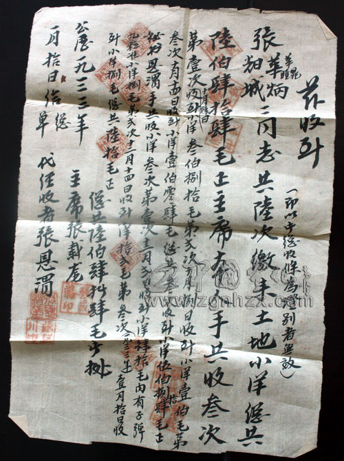 “茲收到張耀城、張華炳二同志共六次繳來土地小洋總共六百四十四毛正,主席本人手共收三次,第一次十月四日收到小洋三百八十毛;第二次十月八日收到小洋一百毛;第三次十月十四日收到小洋一百零四毛;總共三次收到小洋五百八十四毛正。秘書恩渭手共收小洋三次,第一次十二月二日收到小洋四十毛,內有子彈九粒,準小洋八毛,;第二次十二月十四日收到小洋十二毛;第三次(1933年)一月十日收到小洋八毛,共總六十毛正。公歷1933110日,給總單。主席張載尨,代經收者張恩渭?!?SPAN lang="EN-US">