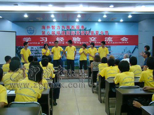 ??? 在交流會上還組織了“猜詞”、“詞語接龍”游戲。邁克爾?貝特和默娜?貝特夫婦興致勃勃地登臺表演,夸張的表情和幽默的話語,引來陣陣笑聲。營員們紛紛上臺參與游戲。最后,8名外教還為在前一階段表現突出的營員頒發了獎品,整個交流會洋溢著輕松愉快的氣氛。“第一次覺得英語還可以這么學,英語課是這么輕松。這次學習交流會讓我受益匪淺。”一位營員這樣表達了自己的心聲。(劉才恒)