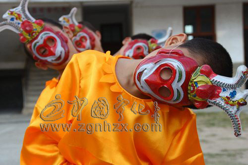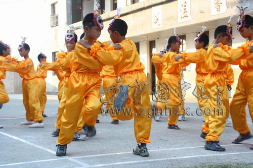 近失傳的回回舞是湖村鎮石下村獨特的傳統舞蹈,創于明朝末年。由四個小兒童,1人持檀板,2人腹扎中鼓,1人敲蘇鑼,各人持續敲擊,并配以簡單舞蹈而成。四個兒童,各人頭縶蘇巾,身穿背褡,腰扎白裙,畫上花臉,給人神異感。其教授者是一名80高齡的老者,由于身體原因,只能通過他的口授,由湖村鎮的文化站和湖村中心學校的老師排練指導,演員則是湖村中小的孩子們。