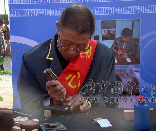 ???? 10月16日,在第十七屆世界客屬石壁祖地祭祖大典現場,一名戴著老花鏡的老者正聚精會神地用刻刀雕刻木活字,他時而放下木活字遠觀,時而用刻刀小心地將多余部分剔除,臉上流露出滿意的笑容。