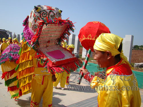 ??? 據該舞引者范貴伙介紹,棠地村的團盤也10多年未表演,為了在祭祖大典上亮相,他們9月初就開始組織村民表演排練。“光扎這個龍頭就要提前1個多月,因為龍頭都是用竹片扎的,當時就有二三十斤,要曬干來才舞得動。”旁邊的一位表演者馬上就插話,“我們四點鐘就起床出發來這里了。”