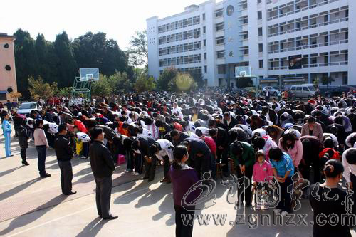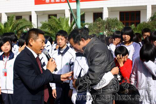 “現在請同學們站起來,握住父母的雙手。……你們是否感受到父母那雙粗糙的手,是否看到父母為了你、為了家操勞,原本烏黑的頭發如今已是白發點點。……”在