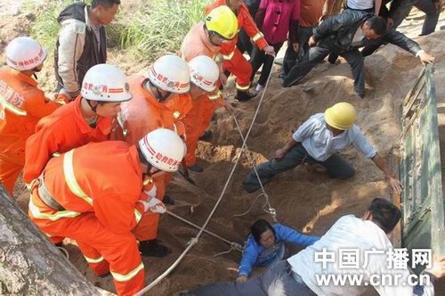 在救援過(guò)程中,為防止上方沙石下滑對(duì)婦女造成二次傷害,消防官兵立即將安全繩綁在婦女腋下,并在附近找來(lái)了門板和木板堵住上方下滑的沙石,隨即用鐵鏟將婦女周圍的沙子刨出。救援準(zhǔn)備工作完成后,6名消防官兵在當(dāng)?shù)厝罕姷膮f(xié)助下,成功將被困婦女拉出。