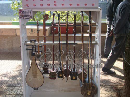 ??? 在展覽現場還有一排掛著各式各樣樂器的架子也引來過往群眾圍觀。只見架子上掛滿了琵琶、柳琴、二胡等樂器。據羅永新老人介紹,這些樂器都是他親手做的。因為原先有做木工活的愛好,便把制作樂器作為健身練腦的活動。如今,老人已制作了28把樂器。