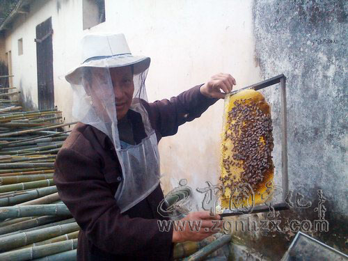 ??? 一開始,筆者還以為養(yǎng)蜂跟養(yǎng)雞養(yǎng)鴨一樣,要先從市場購買小蜜蜂。但施祿昌笑著說:“小蜜蜂不用買,更不用錢,附近山上,到處都有蜜蜂,直接將野蜂馴養(yǎng)過來就可以了。家蜂都是從野蜂馴養(yǎng)過來的,馴養(yǎng)蜜蜂首先要找蜂源,就是蜂巢。找到蜂巢后要將蜂王用手指輕輕捉住,放至火柴盒里里帶回來,放進養(yǎng)蜂箱,這樣其他雄蜂、工蜂也都跟著回來了,而后小心馴養(yǎng),這群蜜蜂便成家蜂了。這些都是我一點一滴摸索出來的。”
