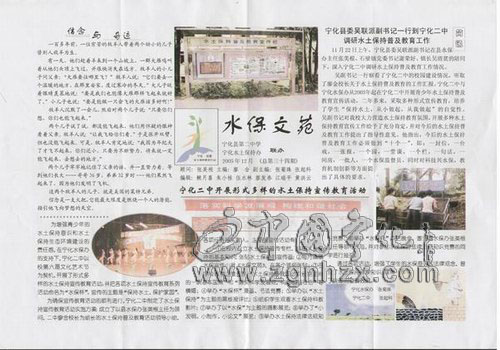 寧化二中位于寧化西部的石壁鎮。該鎮紫色土水土流失面積大,是全省嚴重的水土流失區之一。為增強青少年水土流失與生態安全意識,鼓勵學生積極參與水土保持科普宣傳教育活動,2003年開始,寧化二中與寧化縣水保辦聯合辦起了《水保文苑》校報,并以此為基礎開展一系列水土保持活動。該校請來縣里水保專家當顧問,并制定詳細的方案。通過組織學生參觀水保基地,開講座等形式,讓學生感受到水土保持的重要性。學校的6位指導老師還積極組織學生搜集水土保持素材,豐富《水保文苑》內容。