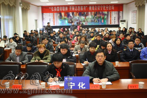??? 寧化在縣電信局5樓設立分會場,組織收看視頻會議??h委常委、宣傳部長鄭曉星,副縣長林翠玲,縣文明委、縣未成年人思想道德建設聯席會議、縣社會志愿服務活動協調小組成員單位負責人,部分省市縣文明單位(學校)志愿服務隊負責人,擬恢復或申報2012-2014年度新一屆省市縣級文明單位(學校)和縣直有關部門負責人參會收看。