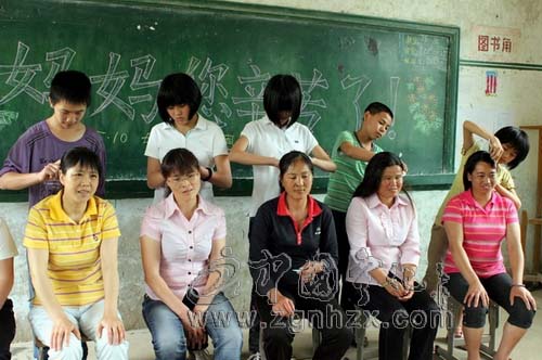 ??? 活動現場,孩子們有的為母親梳理頭發,有的為母親修剪指甲,有的為母親揉肩按腿,有的撫摸著母親長滿老繭的手掌輕聲交談……