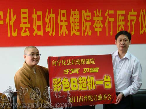 ??? 5月16日,廈門南普陀寺慈善會捐贈彩色B超機儀式在寧化縣婦幼保健院舉行,南普陀慈善會為該院捐贈一臺套價值30余萬元的全數(shù)字彩色B超機。寧化縣衛(wèi)生局、縣婦幼保健有關(guān)人員參加了捐贈儀式。