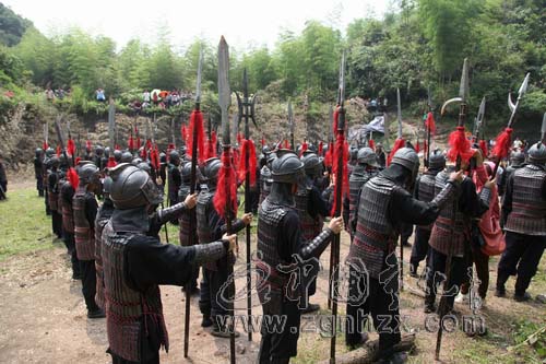 ??? “等會我們就要拍武戲。”閻清秀說,今天拍的武戲是官兵圍剿葛藤凹,畬族山民和客家人守住山口,團結一心與官兵對抗等內容。因為《葛藤凹》主要是表現客家文化形成,是一部現實主義題材的影片,主要是文戲。武戲只占全劇百分之零點幾。