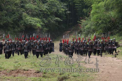 “拍戲時不許笑。”“你們是軍人,要拿出軍人的精、氣、神來。”幾十分鐘后,戲正式開拍。當天拍的是官兵圍剿葛藤凹,畬族山民和客家人守住山口,團結一心與官兵對抗等內容。其中有一個戲份是官兵排著整齊的隊伍向葛藤凹進軍。雖然是個短暫的戲,但這個鏡頭就拍了四五遍。由于天氣炎熱,學生們穿著厚厚的戲服,但很少有學生抱怨。