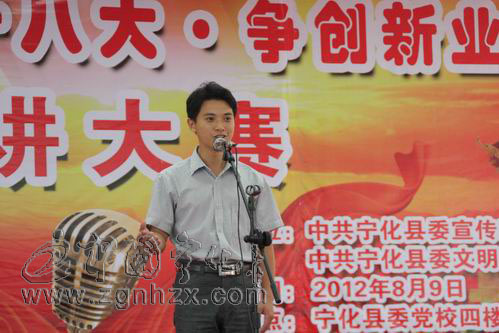 ??? 8月9日,寧化舉行由寧化縣委宣傳部、縣委文明辦主辦的“喜迎十八大 爭創新業績”主題演講賽。28名來自鄉鎮、機關黨委(黨總支)的選手參加了比賽??h委常委、宣傳部長鄭曉星為獲獎選手頒獎。