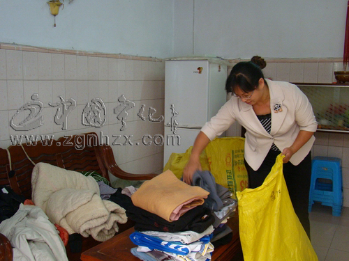 張福香在家中整理寄往寧夏的舊衣服