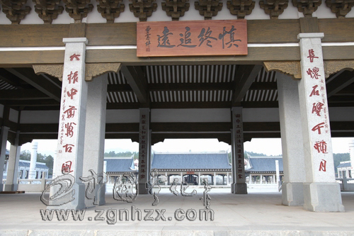 ??? 山門上方“慎終追遠”四個大字熠熠生輝,由香港金利來的董事局主席曾憲梓題寫。