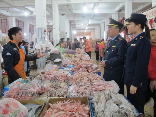 為進一步加大“八閩紅盾出擊--元旦春節(jié)食品市場專項整治大行動”的工作力度,日前,寧化縣工商局開展為期一周的冷凍食品專項整治工作,重點加大對冷凍食品經(jīng)營戶以及相關(guān)進出倉庫的檢查力度,對進貨查驗、索證索票制度落實情況進行認真細致的檢查,進一步規(guī)范冷凍食品經(jīng)營行為。圖為該局執(zhí)法人員在農(nóng)貿(mào)市場檢查冷凍食品。(吳讀增)