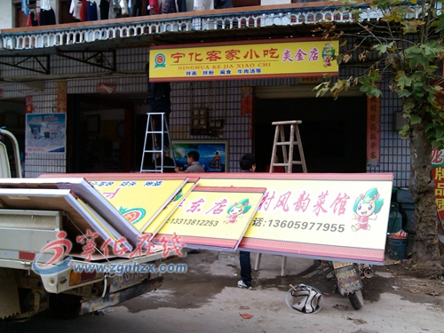 11月15日,在寧化中沙鄉集鎮上,工作人員正忙碌著給客家小吃店安裝統一制作的客家小吃牌匾。