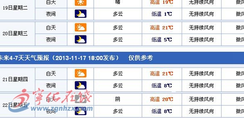 據縣氣象臺預報,19日,晴到多云,最低氣溫4℃,最高氣溫20℃;20日,多云,氣溫5℃~21℃;21日,多云,氣溫8℃~21℃。(本網記者)