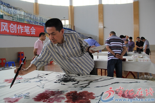 ??? 當日上午,書畫家們先后走訪了縣客家博物館、塔山公園等地后,在縣體育館舉行了書畫創作筆會。書畫家們鋪開宣紙,盡情潑墨揮毫,把在寧化的所見所聞所感,融注在細膩的筆端上。隨著手中筆鋒的翻飛轉動,30余副書畫作品出爐。期間,省市書畫名家們還集體合作,為即將并落成的客家祖地博物館創作了八尺巨幅花鳥國畫《花開五福香飄四?!?。寧化書畫愛好者現場觀摩了畫家們的創作。