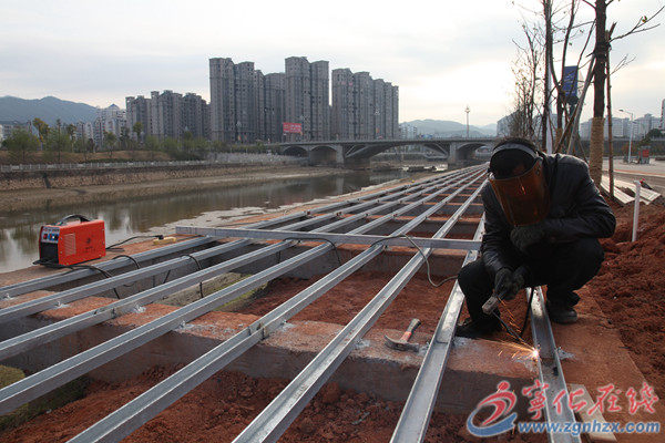 工人正在城區(qū)江濱江景橋至中環(huán)橋的休閑木棧道上焊接鋼結(jié)構(gòu)