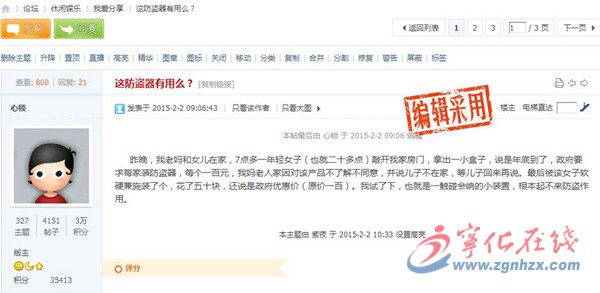 網友“心鎖”在論壇上寫道,當日只有母親和女兒在家,晚上七時許,一年輕女子敲門,謊稱自己為政府工作人員,并告訴老人政府要求每家都要安裝防盜器,每個一百元。由于老人家對該產品不了解,也不同意安裝,并說兒子不在家,等兒子回來再說。該女子不依不饒,軟硬兼施,強行安裝好后收取了五十元,并說是政府優惠價。另一位網友“砂糖”也遇到了同樣的情況,一白衣女子敲門,有好幾個人跟隨,并配有工作牌,了解情況后,因為覺得沒有用,便將女子攆走了。