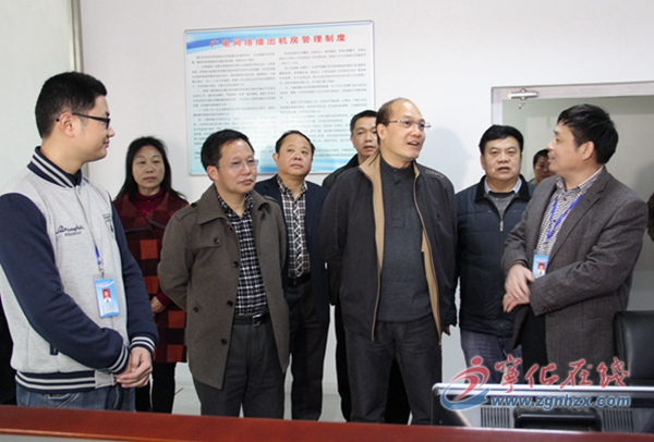 肖長根(右三)、陳?。ㄓ宜模?、陳瑞鏡(右二)、吳金珠(左二)廣電機房慰問調研