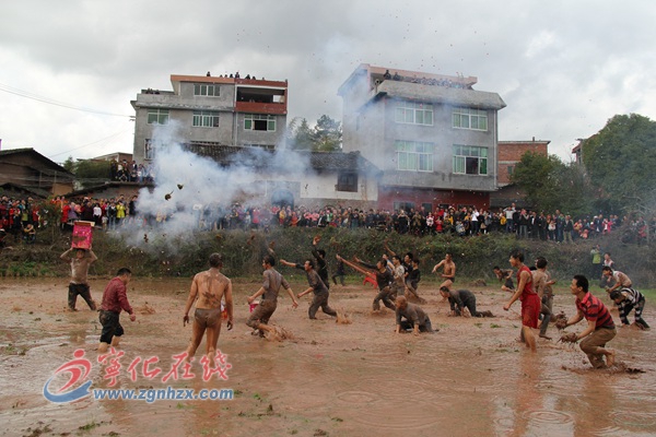 11時左右,游行隊伍回到村口。這時,十幾個小伙子抬起“五谷神”沖入泥水田中奔行,很快就連人帶神像一起摔倒在泥水田中,他們從田里挖起一團團泥巴摔向抬“五谷神”的人,于是一場泥水大戰正式上演:摔泥巴、潑泥水、摔跤,相互追逐,相互嬉鬧,個個成為泥人。盡興之后,將“五谷神”抬上田邊,用清水洗凈送回廟中。