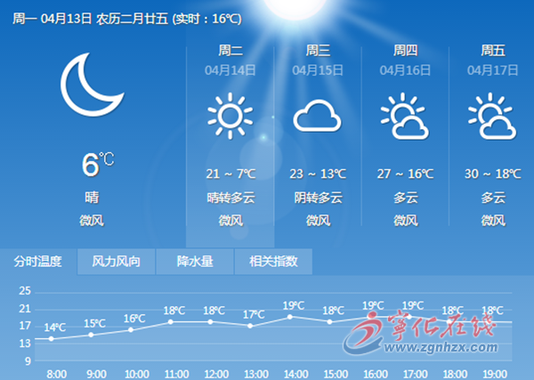 具體預報,13日:晴,氣溫6-20℃;14日:晴轉(zhuǎn)多云,氣溫7-21℃;15日:陰轉(zhuǎn)多云,氣溫13-23℃;16日:多云,氣溫16-27℃;17日:多云,氣溫18-30℃;18日:雷陣雨,氣溫20-25℃;19日:中雨,氣溫20-27℃。(羅 鳴)