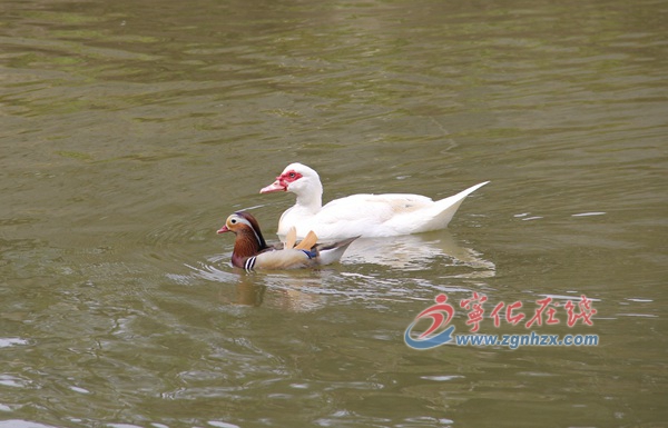 ??? 池塘里,這只漂亮的鴛鴦看到陌生人,一開始顯得有些緊張、警覺,但過了一會就放松了,跳進水中,抖動著翅膀,顯得很放松,和鴨、鵝一起嬉戲、暢游起來。