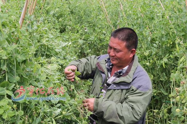圖為張道龍在蔬菜基地采摘荷蘭豆