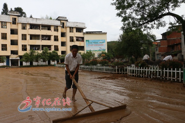 ??? 方田中心學(xué)校此次遭受70多年來最大的洪澇災(zāi)害,引發(fā)電力、通信和交通中斷及多處山體滑坡等次生災(zāi)害。由于學(xué)校地勢偏低,再加上臨河而建,受災(zāi)情況尤為嚴(yán)重——電動校門被洪水沖彎,沿河圍墻倒塌近100米,操場全部被淤泥填滿,山體滑波造成食堂墻體毀壞嚴(yán)重,廚房設(shè)備基本受損。洪水還未完全退去,學(xué)校孫益群校長就帶著老師們積極開展災(zāi)后自救,清理操場上的雜物,洗刷廚房設(shè)備,整理過水辦公設(shè)備,安撫滯留寄宿學(xué)生。