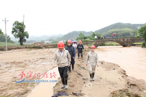 ??? 5月21日13時(shí)20分,省電力公司總工程師周剛帶領(lǐng)運(yùn)檢部主任王永明一行,在三明公司總經(jīng)理羅克偉陪同下,冒雨來(lái)到寧化水毀重災(zāi)區(qū)安樂(lè)鄉(xiāng)謝坊村1號(hào)變,“5.19”特大洪水倒桿斷線搶修現(xiàn)場(chǎng)檢查指導(dǎo)工作。