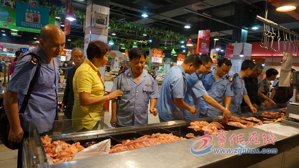 圖為市場(chǎng)監(jiān)督管理局干部災(zāi)后前往超市檢查肉類食品