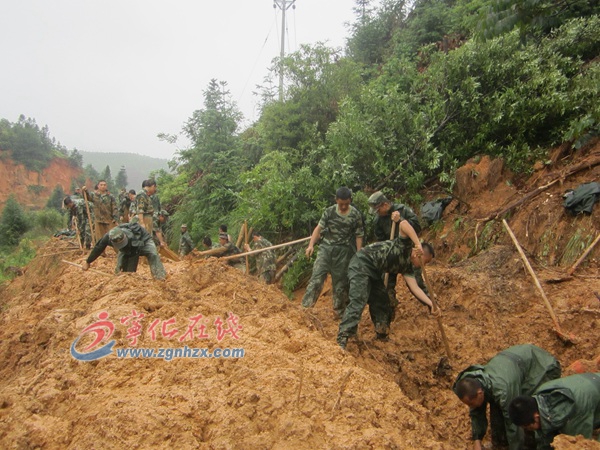 ??? 5月23日,淮土鎮抽調鎮村兩級干部、黨員、基干民兵與福建武警總隊三明支隊官兵350余人組建22支搶險突擊隊,全力搶修橋下水庫總干渠溫坊引水工程。