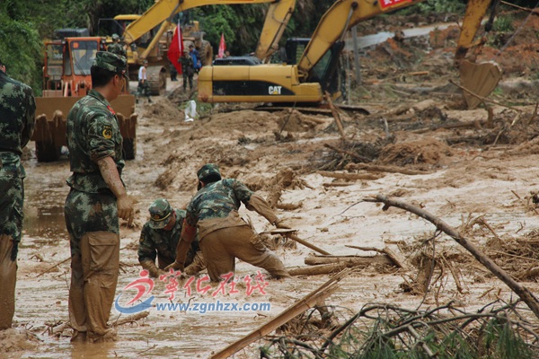 ??? 搶通泥坑村公路后,中隊又接到為縣道治平段搶險的任務。