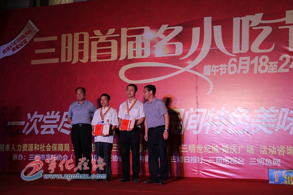 ??? 6月24日,三明舉行首屆名小吃節(jié)文藝晚會(huì),現(xiàn)場(chǎng)向74名(人次)獲小吃美食展參評(píng)獎(jiǎng)的選手進(jìn)行頒獎(jiǎng),寧化小吃業(yè)主榜上有名,寧化金山酒家廚師邱德雄制作的白玉豆腐餃獲小吃類金獎(jiǎng),他同時(shí)榮獲小吃制作能手及五一勞動(dòng)獎(jiǎng)?wù)拢瑢幓〕赞k獲優(yōu)秀組織獎(jiǎng)。