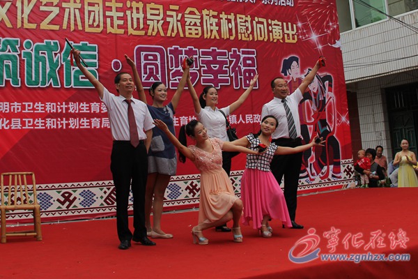 ??? 演出活動由三明市衛(wèi)生和計劃生育委員會主辦,寧化縣衛(wèi)生和計劃生育局、縣計劃生育協(xié)會、泉上鎮(zhèn)人民政府承辦,以“共筑誠信?圓夢幸福”為主題,融歌舞、相聲、小品、獨唱、變臉、小合唱等于一體,用12個各具特色的節(jié)目營造了濃郁的人口文化氛圍,中間穿插有關(guān)衛(wèi)生計生政策方面的知識搶答,吸引大批群眾紛紛駐足觀賞。