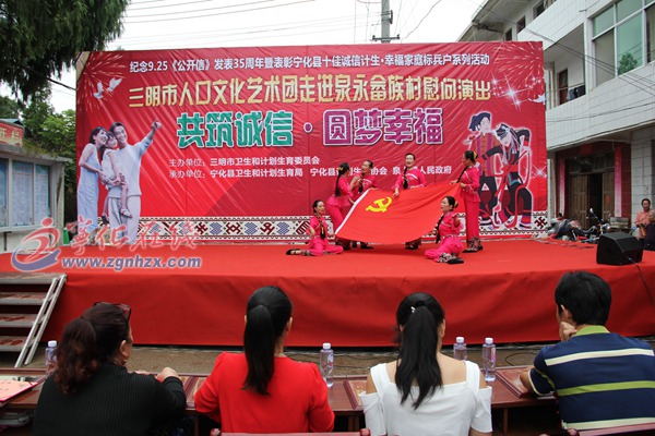 ??? 演出在精彩歌舞《紅色記憶》中拉開序幕。相聲《醫(yī)改就是好》,用幽默詼諧的語(yǔ)言,生動(dòng)展示了近年來三明醫(yī)改取得的成就以及給百姓帶來的實(shí)惠。音樂快板劇《健康優(yōu)生?幸福一生》,巧妙地融入計(jì)生知識(shí)和計(jì)生政策,寓教于樂,通俗易懂。來自泉下小學(xué)的孩子們到場(chǎng)表演少兒舞蹈《中國(guó)范兒》。《愛在誠(chéng)信》、《祝你平安》、《和諧大家庭》、《看病》、《嘮嗑》等節(jié)目,精彩紛呈,高潮迭起,不時(shí)博得觀眾陣陣掌聲。三明市人口文化藝術(shù)團(tuán)團(tuán)長(zhǎng)李海穎聲情并茂地演唱了《父老鄉(xiāng)親》、《青藏高原》等歌曲,她完美、精湛的演唱技藝,再次點(diǎn)燃了觀眾的激情,將演出一次次推向高潮。演出在小合唱《我們的生活充滿陽(yáng)光》中緩緩地落下帷幕。