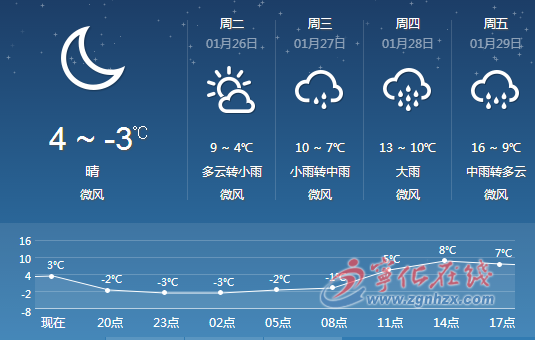縣氣象局預(yù)計(jì),26日起氣溫將逐步回升,26日最低氣溫-7~-4℃,高海拔山區(qū)低于-8℃;27日最低氣溫1~5℃;28日最低氣溫5~9℃。此外,26日夜里起將再次出現(xiàn)一次降水過(guò)程,27日小雨,28-29日中雨,部分鄉(xiāng)鎮(zhèn)大雨。