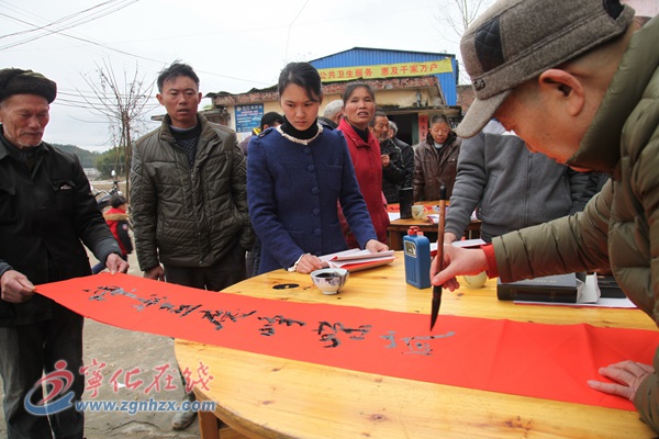 ??? 1月30日,寧化縣中沙鄉(xiāng)樓家村人頭攢動(dòng),笑臉盈盈,由縣委宣傳部組織的多名書(shū)法家來(lái)到這個(gè)庫(kù)區(qū)移民村,為村民現(xiàn)場(chǎng)書(shū)寫(xiě)春聯(lián)。移民群眾手拿紅彤彤的春聯(lián),興奮之情溢于言表。