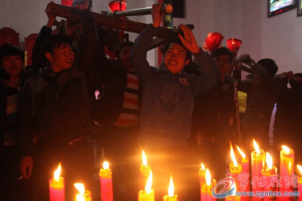 ??? 為此,村民們早早地擺好供桌,用托盤把供奉菩薩的物品擺好,旁邊擺上燭臺,鞭炮,煙花等。托盤上的物品有雞、魚、米飯、蘋果、橘子、米酒、豆腐、紅棗等。他們面帶笑容,虔誠地站在這些貢品后面,有的是一家老小齊上陣。晚7時許,在眾人的簇擁護衛下,“華光尊王”被請出張氏宗祠。當十幾位壯勞力抬著菩薩走出祠堂大門時,嗩吶響起,鑼鼓響起,祈福聲也響起了,這些都是抬菩薩和“橋燈”的前奏。他們先是在宗祠的前面是一個圓形的坪場上巡游,轉了一圈又一圈,場面十分壯觀。四周的樓臺上,也是人頭攢動,瞬間,吶喊聲,鞭炮聲,鑼鼓聲,祈福聲,把整個坪場渲染的神圣而壯觀。緊接著,手拿彩旗的孩童,在圓形幡旗的引領下,一路前行。巡村游開始了,按照原先選定的路線,“華光尊王”和“橋燈” 行走在村道間,村里200多戶人家的鞭炮立即噼噼啪啪震耳欲聾地響徹云霄,騰起漫天煙霧。村民手捧貢品,燃放煙花炮,作揖祈福,敬畏的臉上充滿喜慶歡樂!巡游活動吸引了近千男女老少觀賞,仿佛置身于歡樂的海洋。